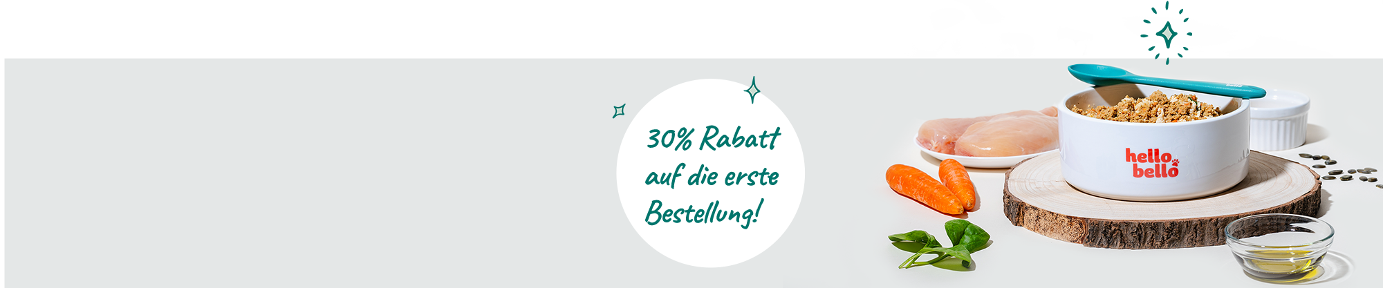 Schenke deinem Hund frische, gesunde Mahlzeiten für ein langes und glückliches Leben. Erhalte 30% Rabatt auf deine erste Bestellung + einmal gratis Leckerlis